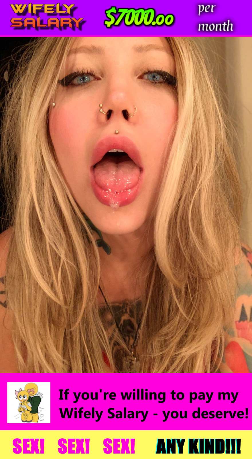 Since Drooling Saliva Lips Pic12 is a $7000.00 Wifely Salary Request, the cost for a woman to list herself for Drooling Saliva Lips Pic-14A thru 14Z is: